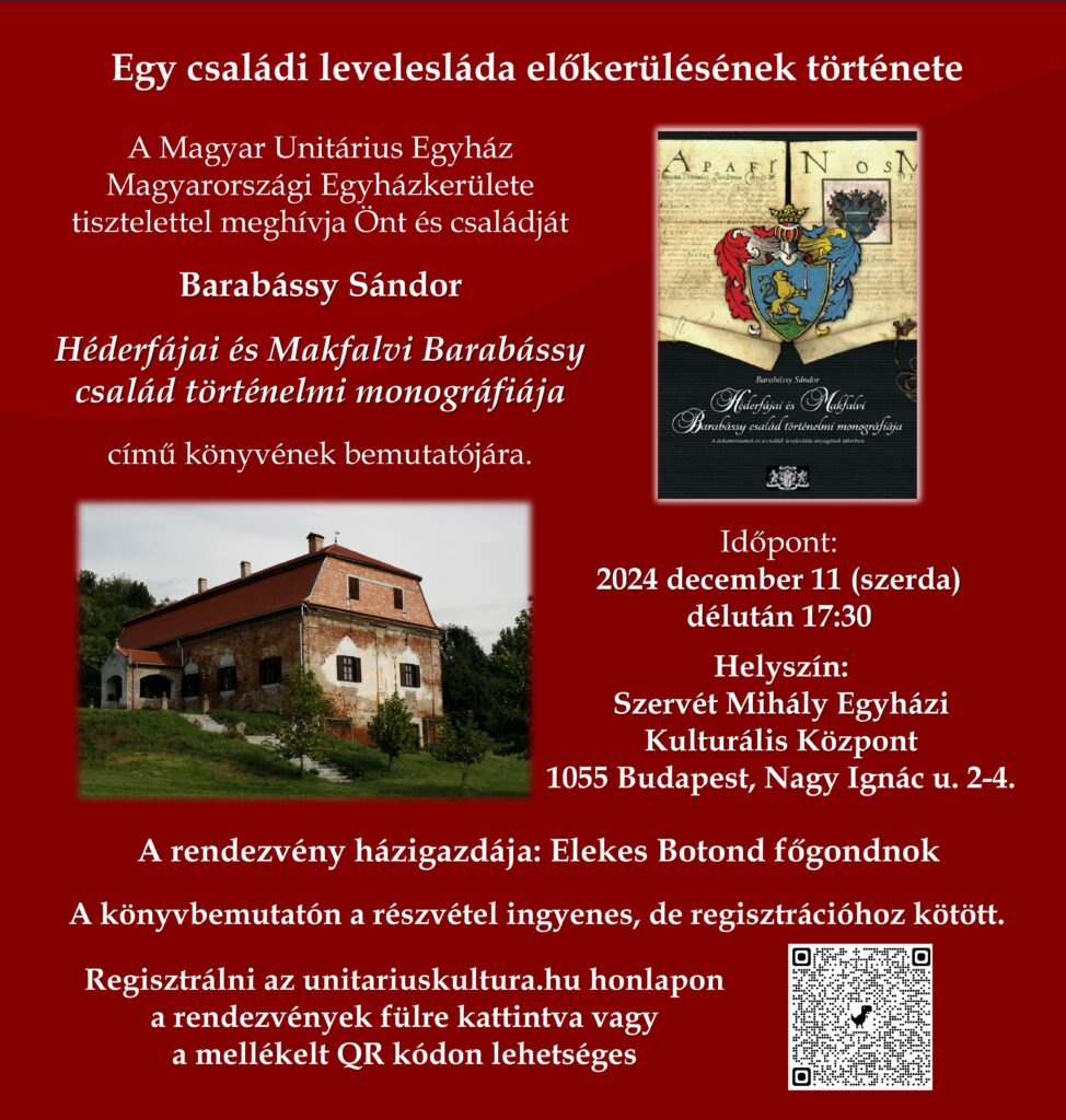 A Magyar Unitárius Egyház Magyarországi Egyházkerülete tisztelettel meghívja Önt Barabássy Sándor: Héderfájai és Makfalvi Barabássy család történelmi monográfiája című könyvének bemutatója.