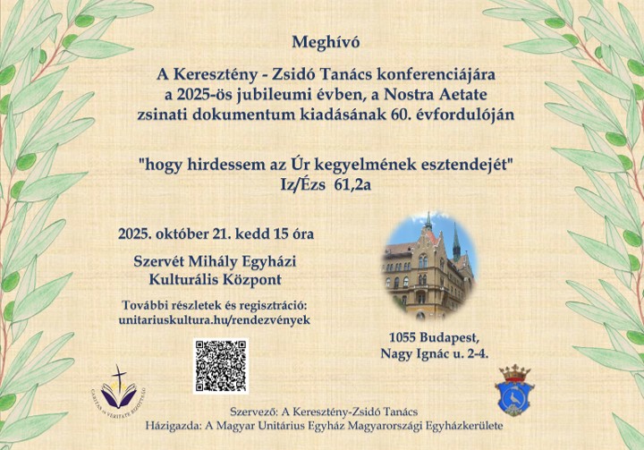 A Keresztény–Zsidó Tanács (KZST) 2025 október 21-én, 15 órai kezdettel konferenciát szervez Budapesten, az Szervét Mihály Egyházi Kulturális Központban (1055 Budapest, Nagy Ignác u. 2-4.). Az esemény házigazdája a Magyar Unitárius Egyház Magyarországi Egyházkerülete A konferencián a részvétel ingyenes, de